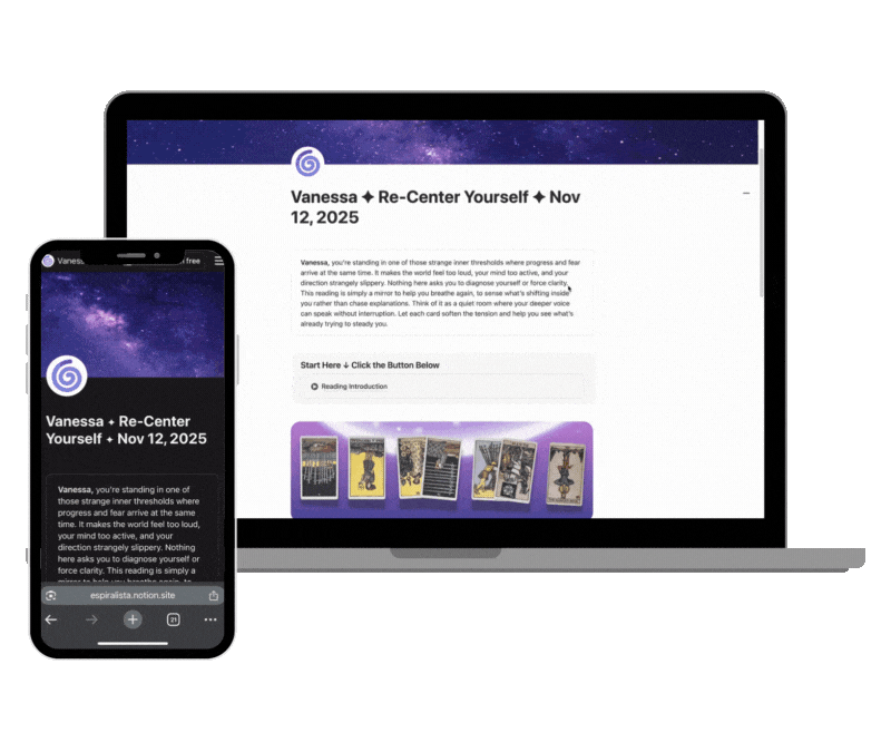 AI analyzes the cards using my methodology: compassionate, symbolic, practical. You receive it as a thoughtfully designed digital reading, accessible from your phone or computer. A guided experience you can move through at your own pace and return to whenever you need it.